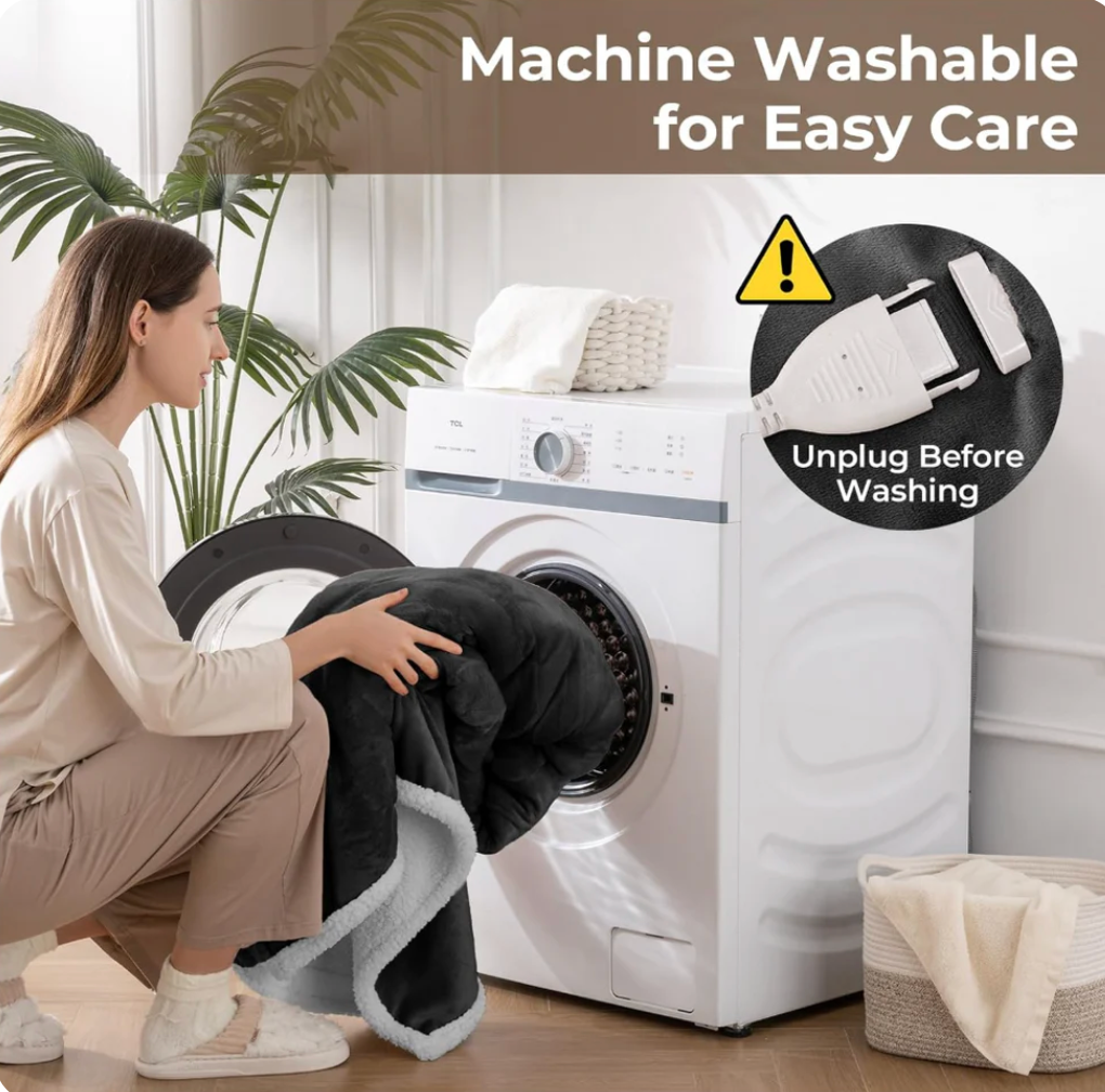 Two things: performance and design. Our upgraded heating system warms up faster and distributes heat evenly through the entire robe, not just one or two panels. And unlike typical throws, Heatedrobe™ has heated foot pockets, oversized coverage, and a plush wrap-around design that gives you that “hugged and cocooned” feeling. It’s engineered for people who are tired of cold toes, cold hands, and cold air leaks. The difference in comfort is instant the moment you put it on.